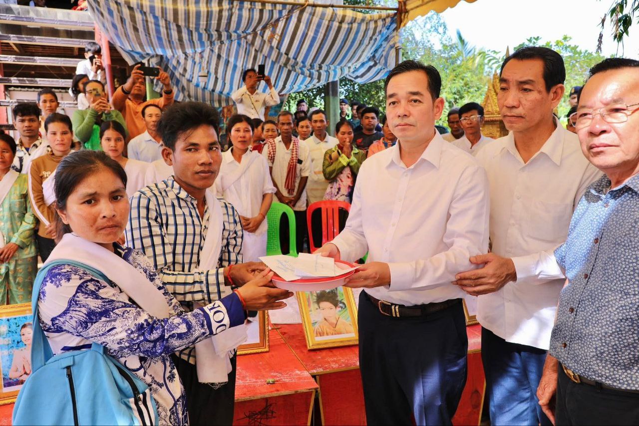 (កំពង់ចាម): ឯកឧត្ដម អ៊ុន ចាន់ដា អភិបាល នៃគណៈអភិបាលខេត្តកំពង់ចាម នាព្រឹកថ្ងៃចន្ទ ទី២៤ ខែវិច្ឆិកា ឆ្នាំ២០២៥ រួមដំណើរដោយថ្នាក់ដឹកនាំ និងមន្ត្រីរាជការ នៃរដ្ឋបាលខេត្ត, កងកម្លំាងមានសមត្ថកិច្ច, អាជ្ញាធរមូលដ្ឋាន និងលោក អគ្គនាយកក្រុមហ៊ុន ហេង ឡុង (ចំការកៅស៊ូបឹងកេត) បានអញ្ជើញចូលរួមរំលែកទុក្ខដល់គ្រួសារព រងគ្រោះដោយអំពើឃាតកម្មដ៏សាហាវយង់ឃ្នង ដែលបានកេីតឡេីងលេីប្រជាពលរដ្ឋ និងកុមារ បណ្តាលអោយបាត់បង់ជីវិតមនុស្ស ចំនួន ៩នាក់ ស្ថិតក្នុងភូមិពោន ឃុំទួលសំបួរ ស្រុកស្ទឹងត្រង់ ខេត្តកំពង់ចាម កាលពីព្រឹកព្រលឹមថ្ងៃទី២៣ ខែវិច្ឆិកា ឆ្នាំ២០២៥។